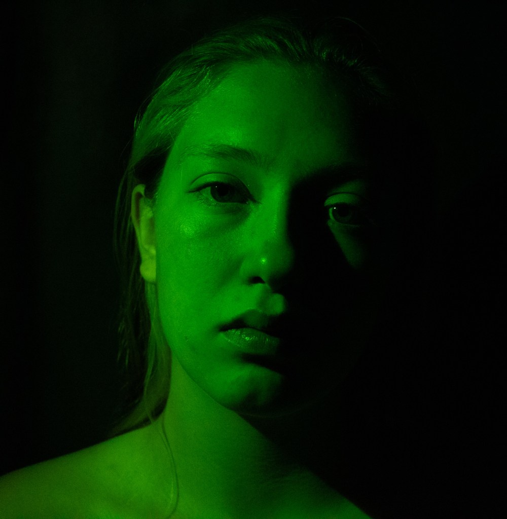 For this assignment, I wanted to experiment with colored light that I could control. At home, I have very little photography equipment, so I layered cling wrap onto my sister’s phone and used a green Sharpie to color the light. It took a lot of practice and patience to get the light to the perfect place. I like the light in this picture because the light falls onto the darker side of the face just enough to establish that half but not to completely light it, which was my intention.