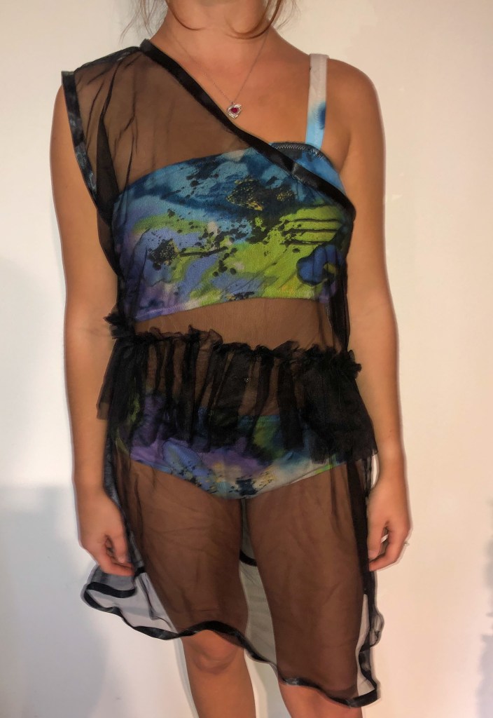 The eye-catching, colorful polyester fabric helps drive the story home. Illustrating her true self, the body pieces are comprised of underwear-like bottoms and a more bandeau, cropped look for the tops. Contributing a bodysuit with a beautiful cape for the last look, Zauel’s first collection ends, but her fashion journey continues.